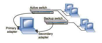 Switch Fault Tolerance (SFT). Provides some fault tolerance between switches when each adapter in the team is connected to a separate switch. Spanning Tree Protocol must be turned on in the switches. SFT teaming mode has been tested with the following configuration only: exactly two members in a team connected to two switches, with one member set as preferred primary and the other as a preferred secondary; the switches' setup was similar to that in the following diagram: