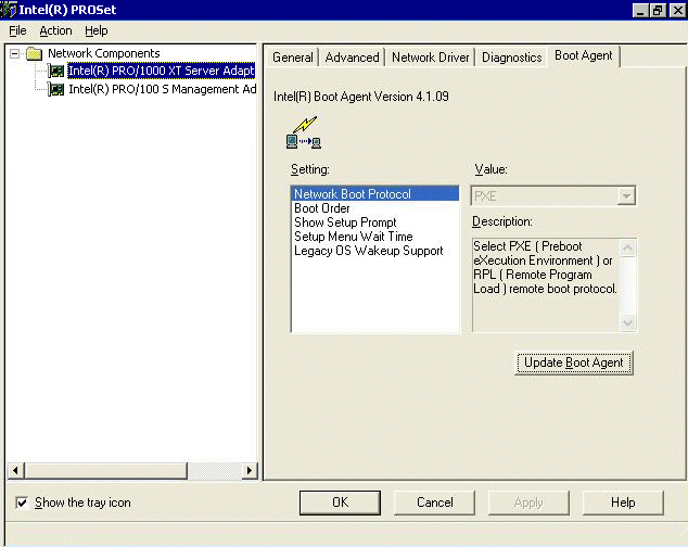 | NOTE: If the Intel Boot Agent is disabled on your adapter, the Boot Agent tab will not appear when you select the adapter in Intel PROSet. Use IBAUtil to enable the Intel Boot Agent. See Running IBAUtil for more information. |
