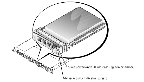 | The green hard-drive activity indicator flashes when the hard drives are in use (see Figure 2-4 for more information on hard-drive indicators). |