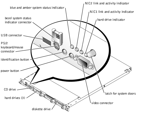 The front panel also incorporates a USB connector, a video connector, and a PS/2 connector to connect a mouse and keyboard using a Y-cable (see Figure 2-2).