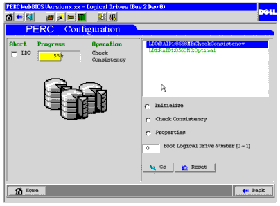 a progress chart displays on the left side of the screen to show how much of the consistency check has been completed. There is also an option to abort the check for any or all logical drives.