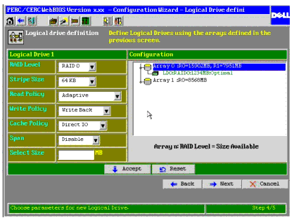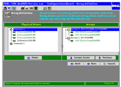 To configure RAID 10 and RAID 50 arrays, you must select RAID 1 or RAID 5 arrays and span them. Perform the following steps to configure a RAID 10 or RAID 50 array: