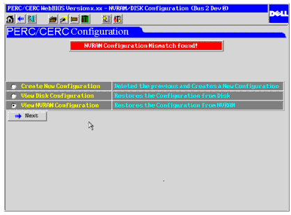 The NVRAM/DISK Configuration screen provides three ways to resolve a configuration mismatch: