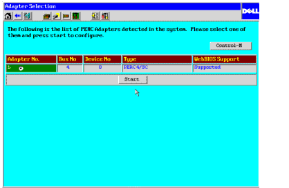 If there are multiple RAID controllers, WebBIOS starts at the Adapter Selection screen after you press <Ctrl><H>. You can use this screen to select the adapter that you want to configure RAID arrays and logical drives for. Select an adapter and press the Start button to begin the configuration. If you want to use the BIOS configuration utility instead of WebBIOS, click the Control-M button.
