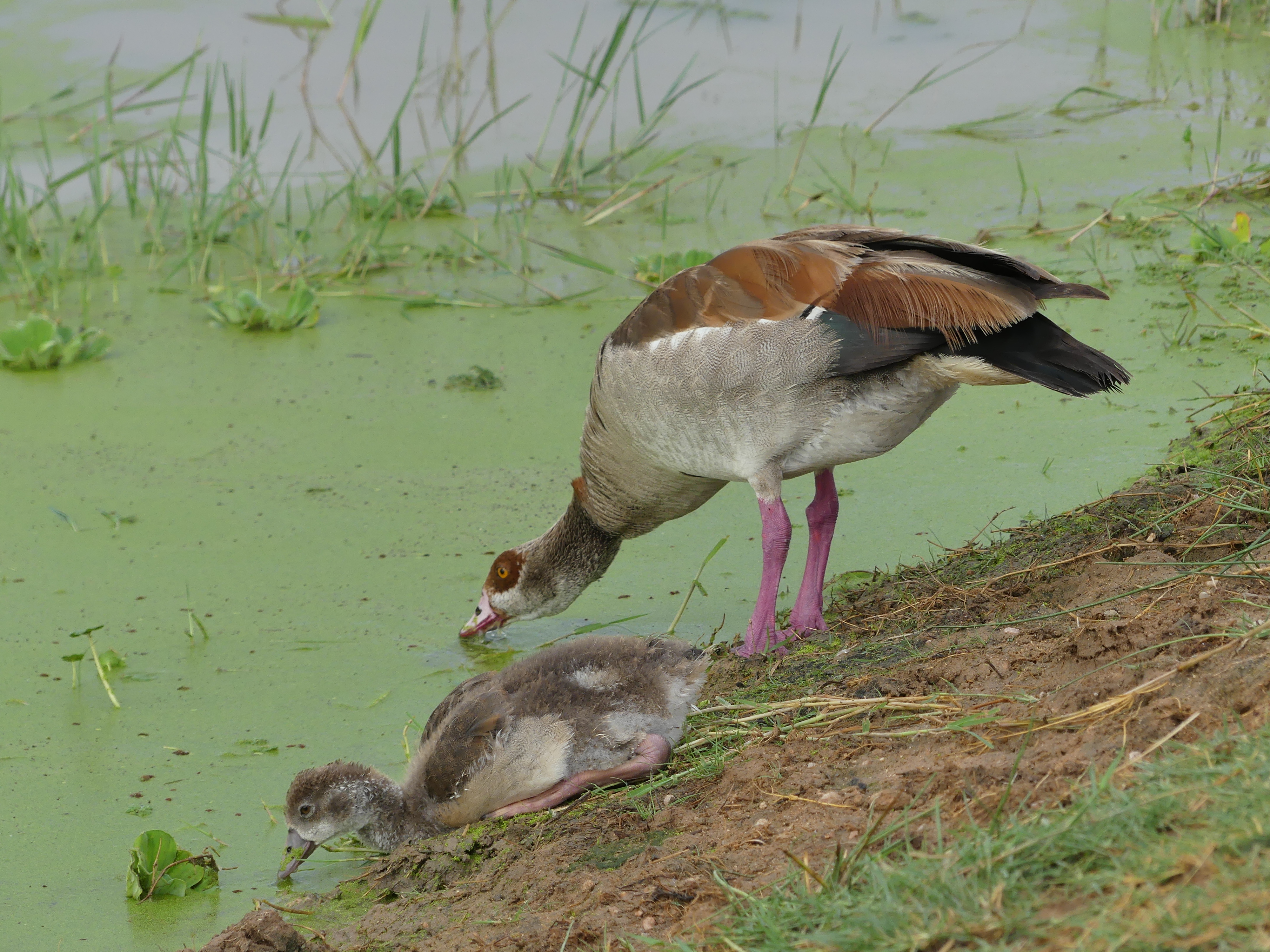 An Egyptian goose and its gosling.