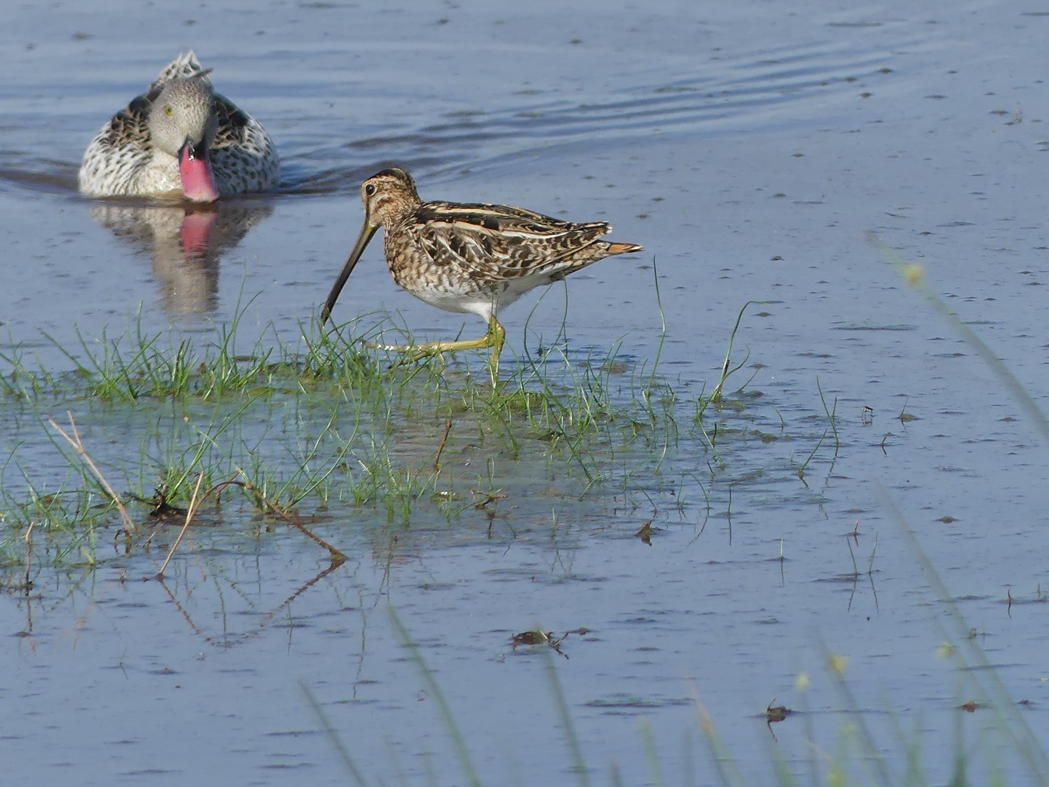 A snipe with a red-billed teal.