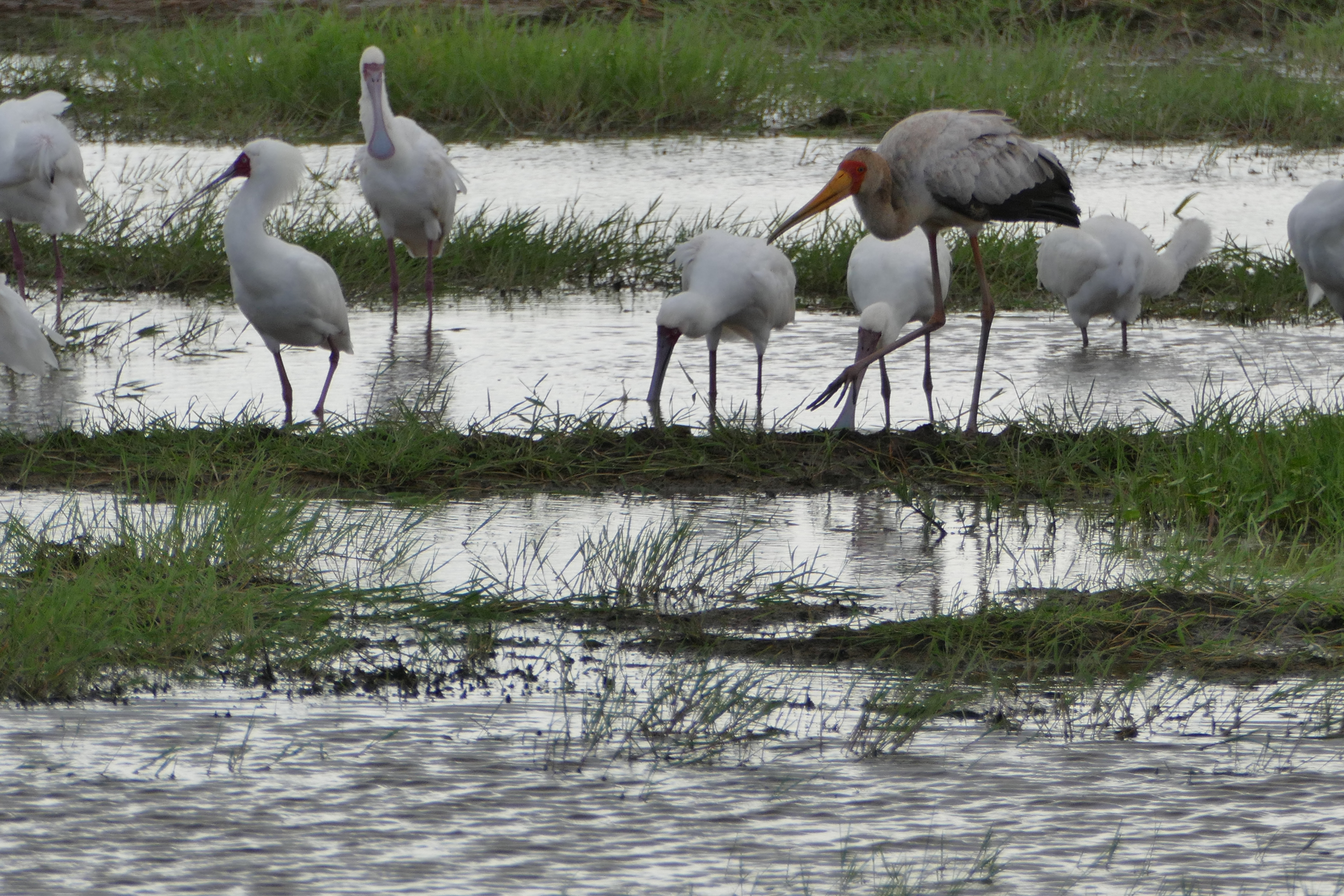 Spoonbills with a yellow-billed stork. There's
