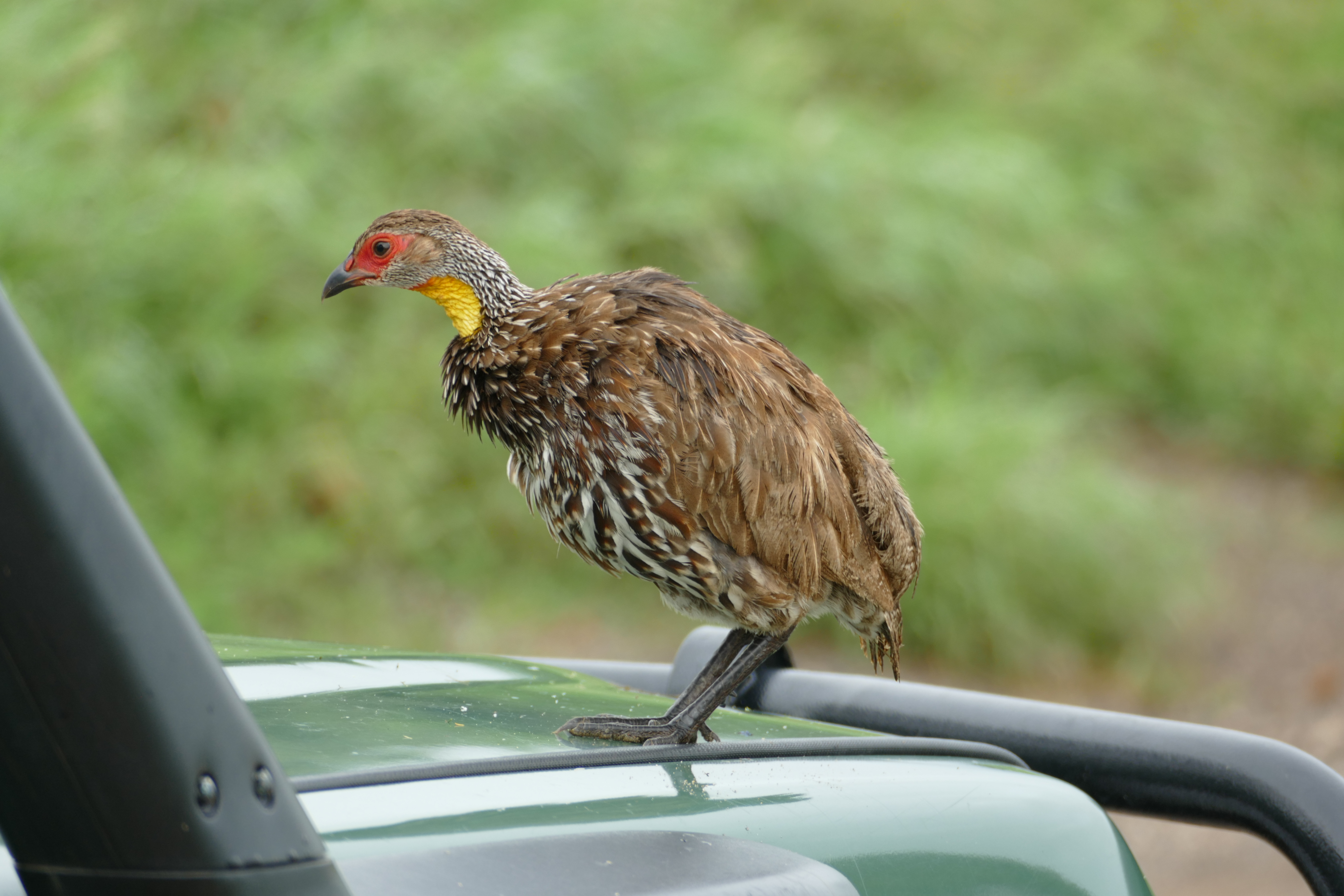 This yellow-necked spurfowl on the hood of our second truck was enough of a draw that another vehicle going in the other direction stopped to photograph it.