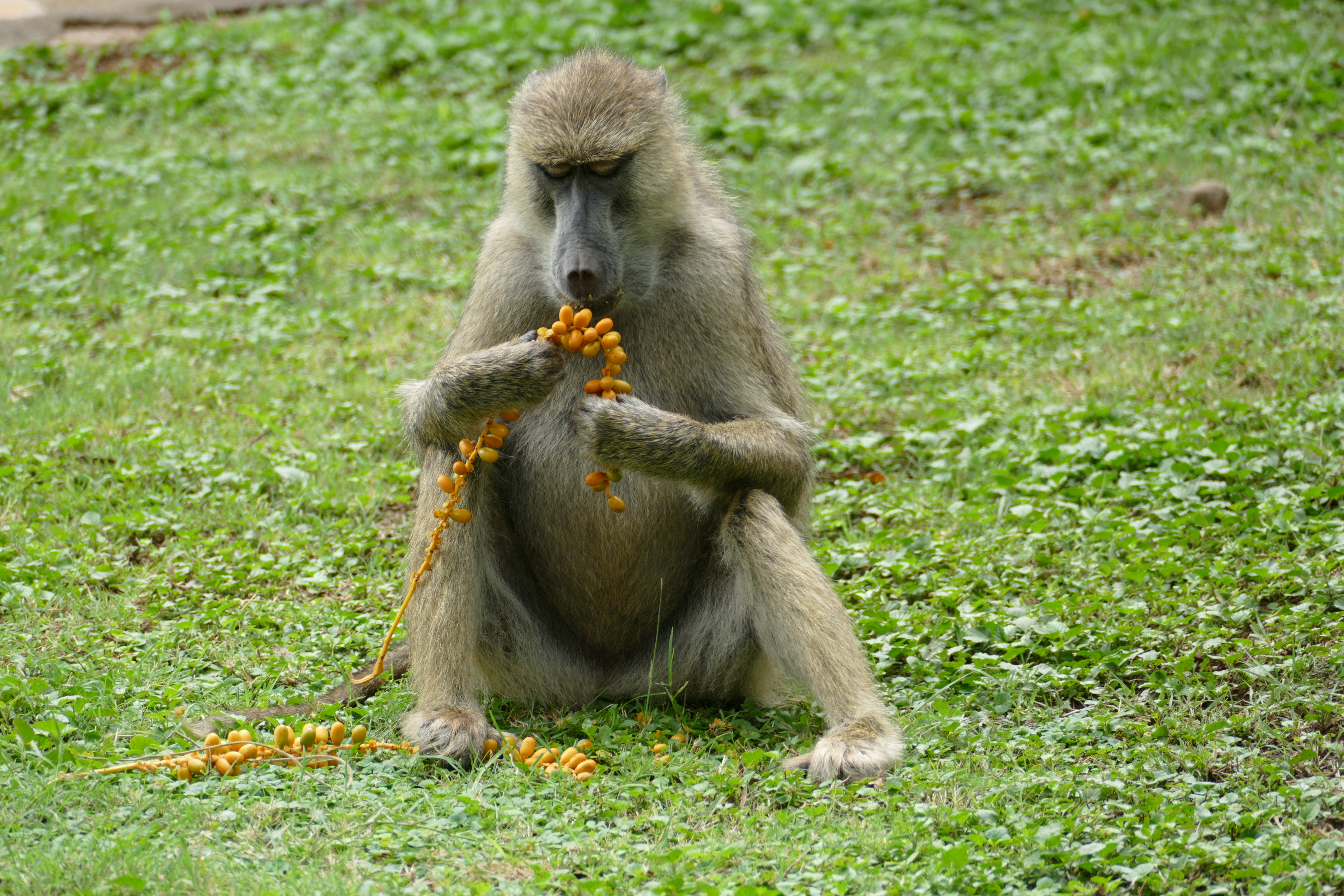 This baboon is eating doum palm fruit.