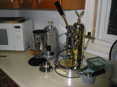 In 2003, frustrated by the inconsistent quality of the espresso from the Pavoni, and with the Rancilio grinder showing its age, I decided to be completely self-indulgent and upgrade. I moved to another lever machine, the Elektra Micro Casa a Leva, with a spring mechanism for ensuring even pressure. I also bought a Mazzer Mini grinder, designed for small cafe use. Neither machine will fit under my kitchen cabinets without modification.