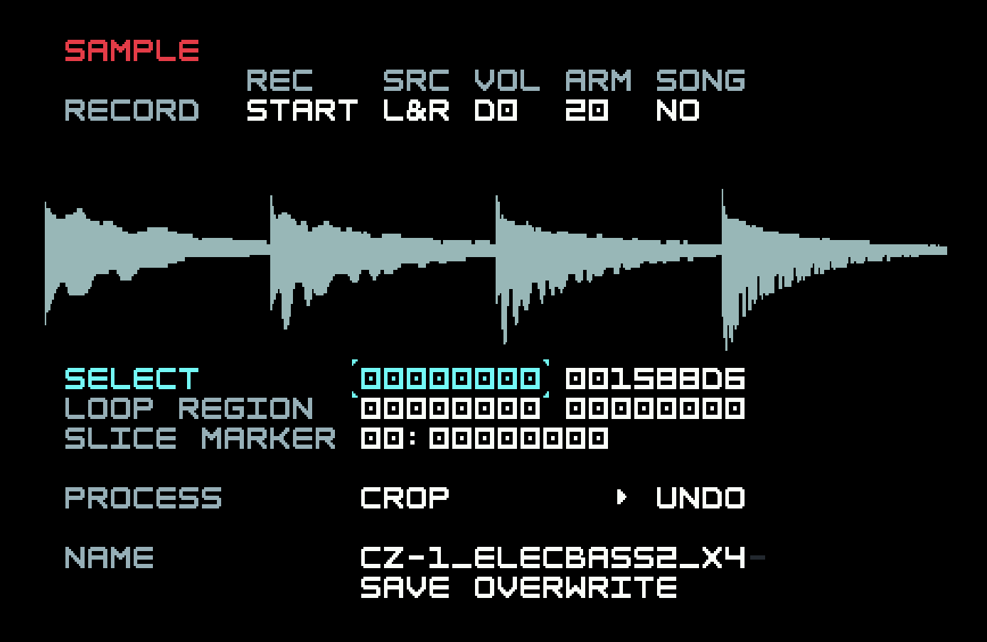 On a computer, you would define the region by clicking in the waveform display and dragging. You can actually do something similar using the touchscreen on M8 (we’ll explain how below) but the screen is small, so it’s really only good for getting in the approximate vicinity and not for fine work. In the Sample Editor, the region is defined precisely by the two fields in the row labelled SELECT. These show the start and end position of the selected region in number of little samples, where the little sample numbered 0 (displayed as 00000000) is the very first one, displayed at far left.