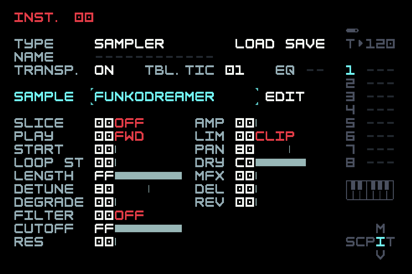Let’s play with it. Create a new phrase and a new Sampler instrument. If you have a long sample at hand, you can use it, but we’ll provide one for you. One common use of slicing is to slice up drum breaks from old R&B, jazz, or funk records. This can be problematic, because in most cases the material is not in the public domain, and permission has not been obtained. There are drum breaks available that have been cleared, but they’re not as compelling and iconic. User Sacco Belmonte on the Dirtywave Discord comes to our rescue. Sacco has recreated some classic drum breaks using drum software on a computer, and made these "cover version" recordings available for free use. Here’s a break we can use (right-click or control-click on the player to download the WAV file). You may recognize it, or be able to guess its inspiration from the file name.