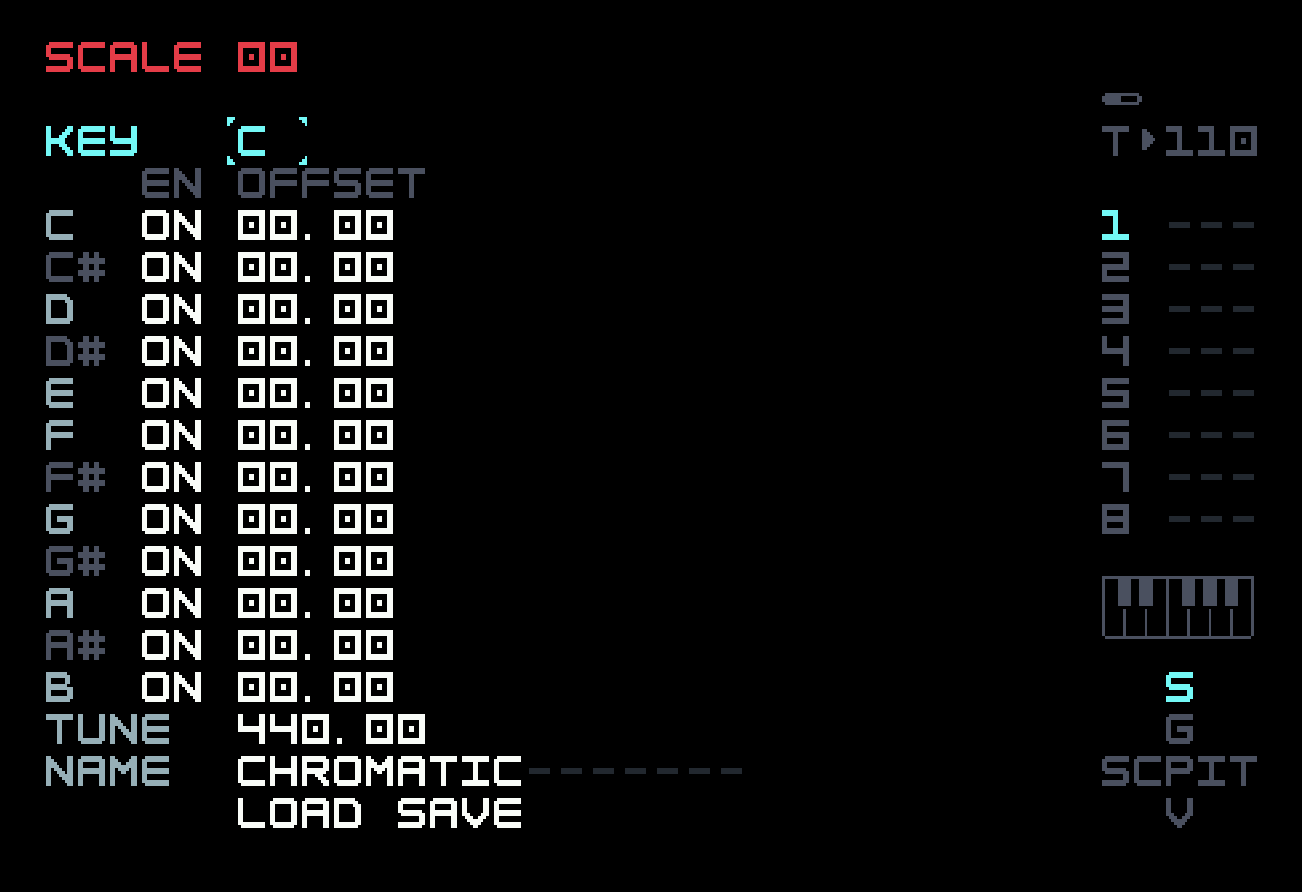 The top row, labelled "Key", specifies the root note of the scale. Changing it also changes the top row of the 12-semitone table that follows. That table has note labels in the first column, and an enable/disable switch for each note in the second column. To build a C major scale (instead of just loading it from the factory scales), we could switch off all the sharp (#) notes. The last column is an offset in semitones, with separately-editable fields before and after the decimal point (as we had with FM ratios). By setting the offset in the C row to 02.00, we could make a C entry in a phrase play as D, if we wanted to. It’s probably more useful to edit the field after the decimal point, if you want to do microtonal work. At the bottom, just above the name field, is an option to change the global tuning, with the value of A-6 given in Hertz (default 440).