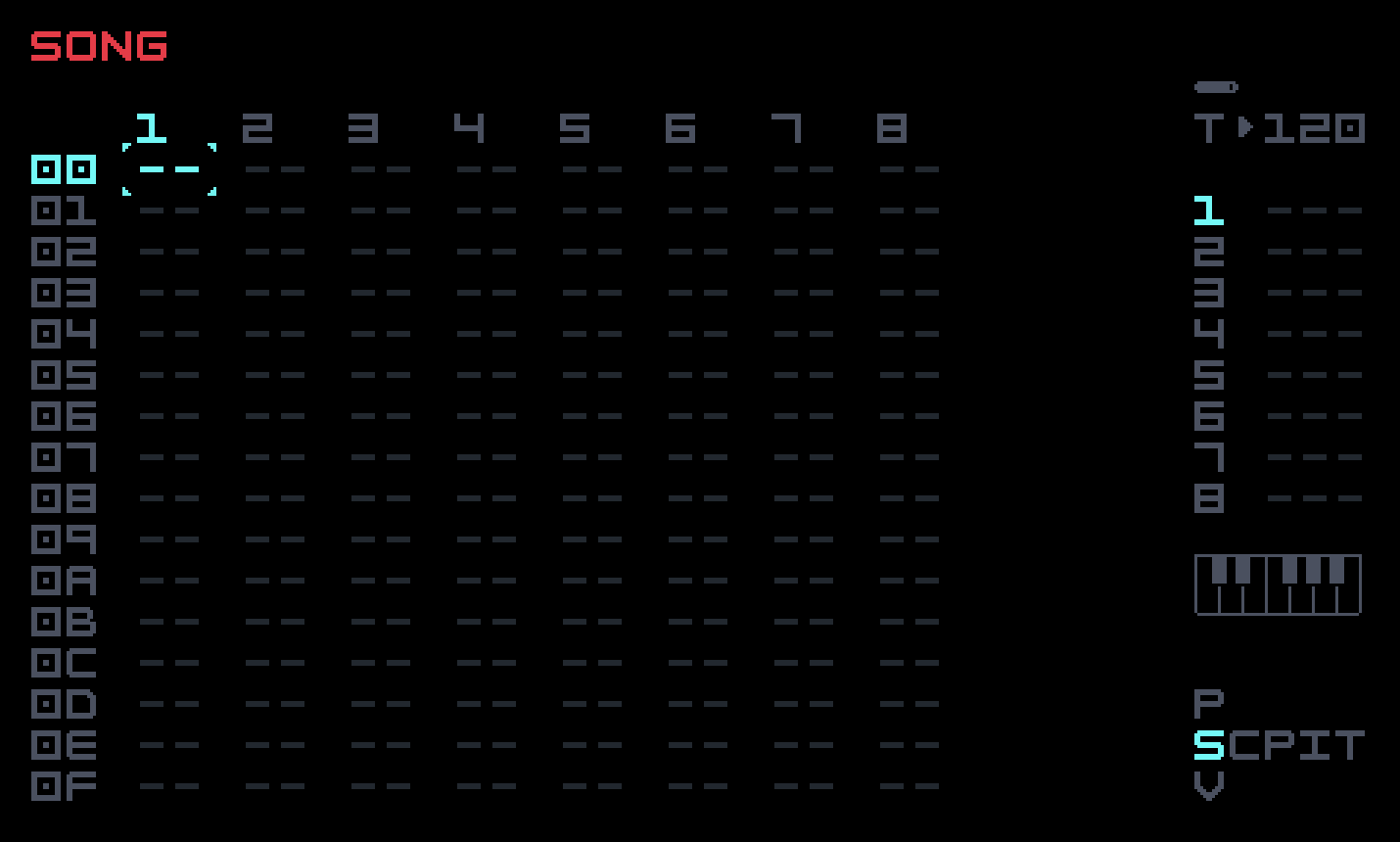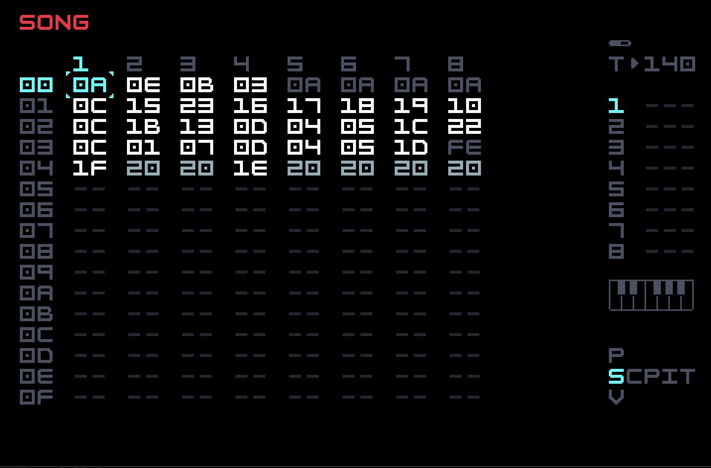 The leftmost column holds row labels. The eight columns to its right are the sequence of chains for each track, with the track number at the top. The screen shows sixteen rows, labelled 00 through 0F, but if you navigate down to the bottom, it will scroll to reveal more rows. Rows can go up to FF, so there can be as many as 256 of them. For our first song, we’re not going to need to scroll.