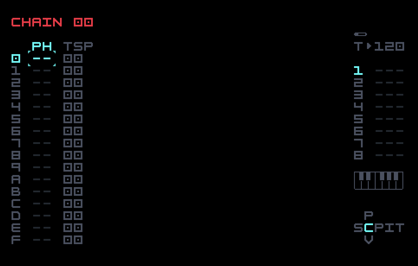 Chains can contain any number of phrases from zero to sixteen, and, as we’ll see, there are ways to end a phrase early or hop around in one. Each track has an independent playhead (position in its sequence of notes). But to tame the potential chaos, it can be advisable to make all of your chains the same length, by padding with empty phrases, and we’ll do that throughout. If you navigate away from the top corner, you’ll see that the 00 is greyed out. That’s because phrase 00 is empty. In general, empty phrases, regardless of their label, are greyed out in Chain View, as a useful visual aid.