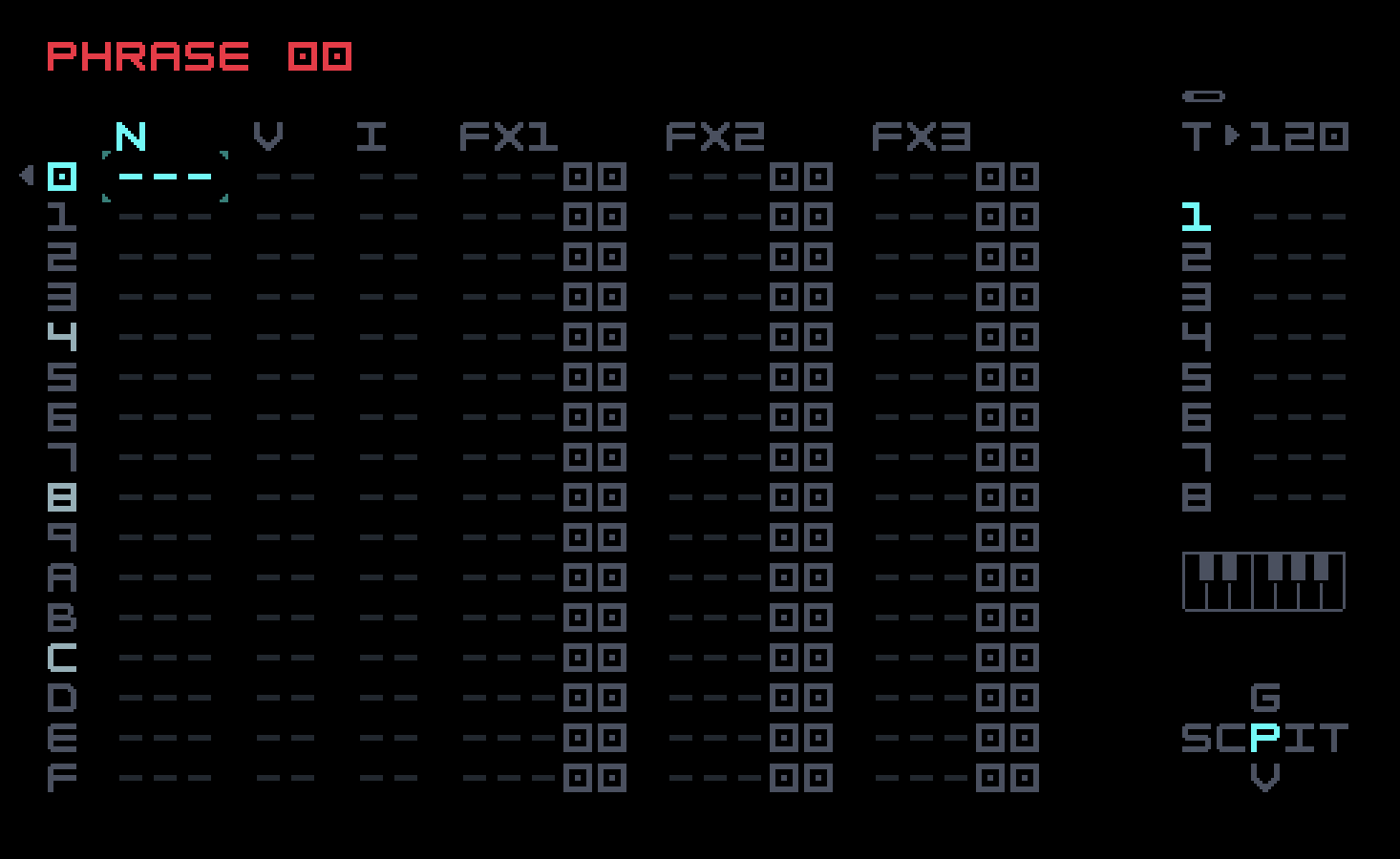 There are two columns. The one labelled PH contains references to phrases. The one labelled TSP contains a value used to transpose a phrase (move every note up by the specified amount). With your cursor on the first row, PH column, tap [EDIT] to add a reference in this cell to phrase 00.