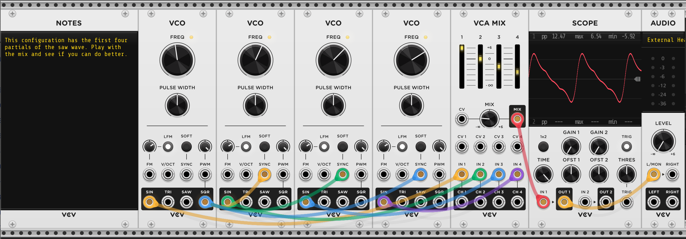 AdditiveSaw has four VCOs (hey! they’re free!) tuned to 220Hz, 440Hz, 660Hz, and 880Hz. The coefficients can be adjusted by the VCA MIX sliders. AdditiveSquare has the same arrangement, but the VCOs are tuned to 220Hz, 660Hz, 1100Hz, and 1440Hz. VCO does not have a way to do phase shifts, but they are not needed for these two waveforms. See if you can improve the shape of these approximations (or, more importantly, the sound).
