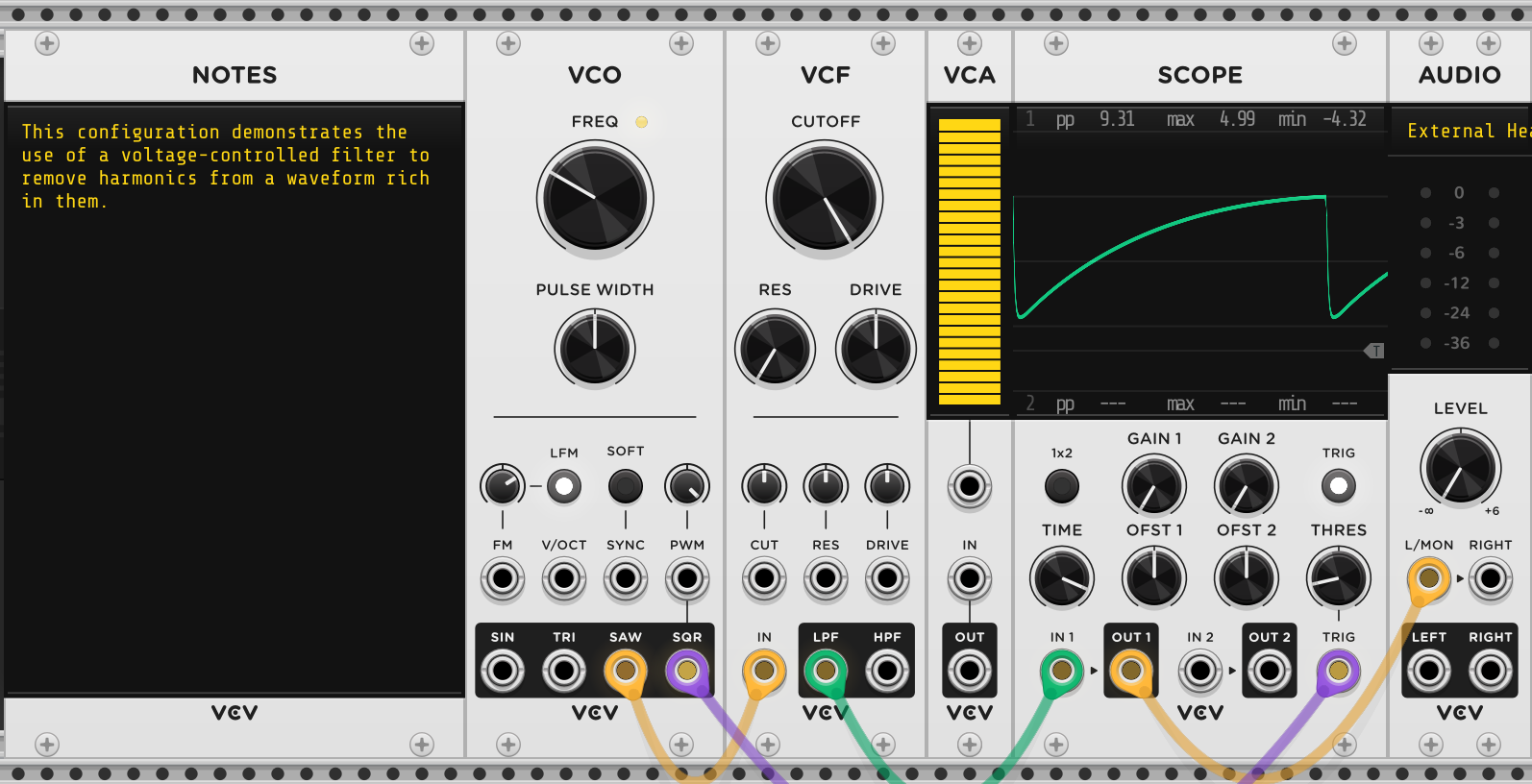 Though VCF is not suitable for acid, the patch Banjo.vcv uses it to create a sound reminiscent of a banjo, though it certainly wouldn’t be confused for one.