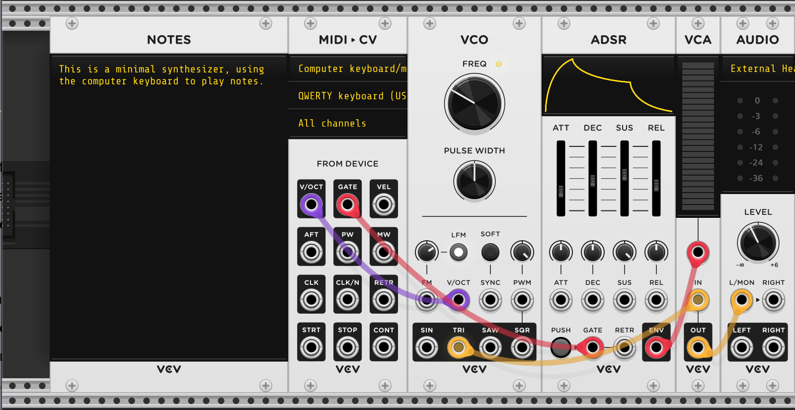 MIDI is a digital standard for transmission of musical information, many decades old. The MIDI-CV module has been configured to let you use your computer keyboard to play notes. Certain keys will play certain notes (look at the documentation to find out which, or just experiment). There is a V/oct output with a cable already going to the V/oct input of VCO, and a gate output going to the gate input of ADSR. The gate stays high as long as you hold down a key. The synth is monophonic (one voice); you cannot play multiple notes at the same time. Polyphony (many simultaneous voices) is possible in VCVRack2, but not with a computer keyboard.