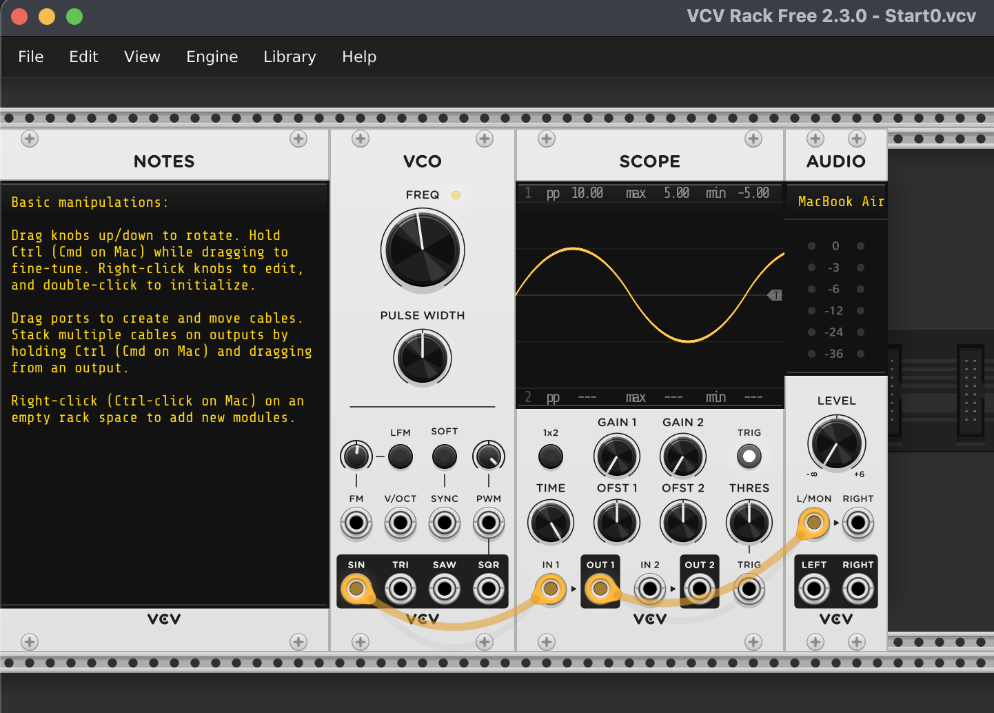 You will see four modules. To the far left is the Notes module, which just contains some text about basic use (how to turn knobs, how to manipulate cables). There are also tooltips and a link to the manual (on the VCVRack website) in the Help menu.