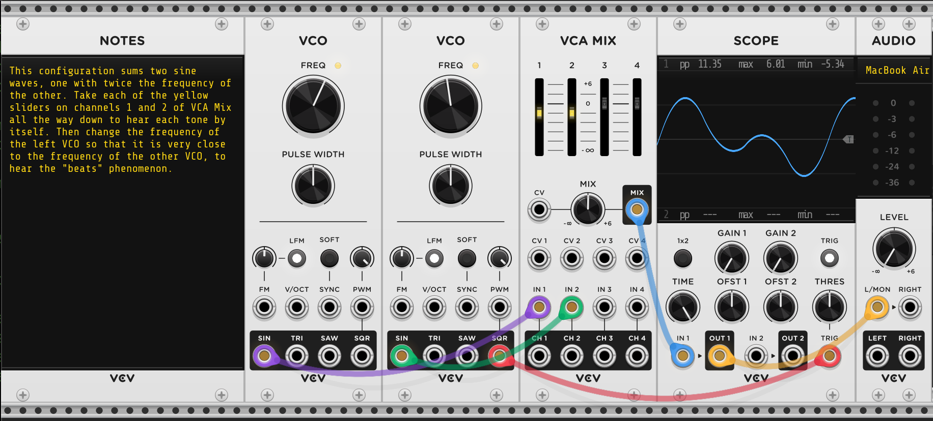 You can hear it with this VCVRack2 patch. Set one VCO to 440Hz and the other to 444Hz. You should hear a slightly unpleasant sound that is pulsing in volume. You can see the volume change on the AUDIO module’s display. Control-drag (command-drag on a Mac) the higher one and pull down slightly to lower it just a bit. The rate of the pulsing should decrease. Without looking at the displayed frequency, keep lowering it in this fine-grained way until the pulsing disappears, at which point both oscillators should be at 440Hz. This is what players do to tune their string instruments. How close did you get?