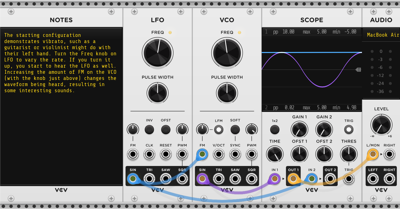 Download the file Vibrato.vcv and open it in VCVRack2.