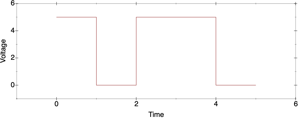 A central operating principle of computers is that voltage is treated in a discrete fashion, with only two possibilities: low (close to 0V) and high (close to 5V). This digital interpretation (as opposed to the more continuous analog interpretation) makes it easier to deal with the accumulation of errors caused by the physical properties of circuits. Our graph becomes a series of horizontal line segments.