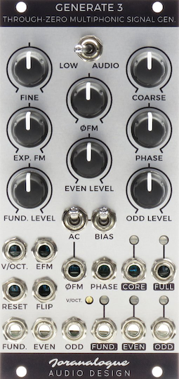You can also see some CV inputs and knobs available on VCO, for FM and synchronization. There is also a PHASE knob and CV input. As previously mentioned, a phase shift is not really audible, but if audio-rate modulation is used with the CV input, the resulting effect is similar to FM. Just plugging the CORE output into the PHASE input and turning the knob results in some interesting timbral changes. In fact, the Yamaha DX7 mentioned above uses phase modulation. Generate 3 is a waveshaping laboratory.
