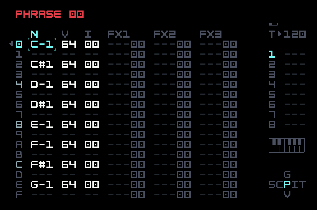 Put the eight notes from C-1 to G-1 on every other row in the phrase.