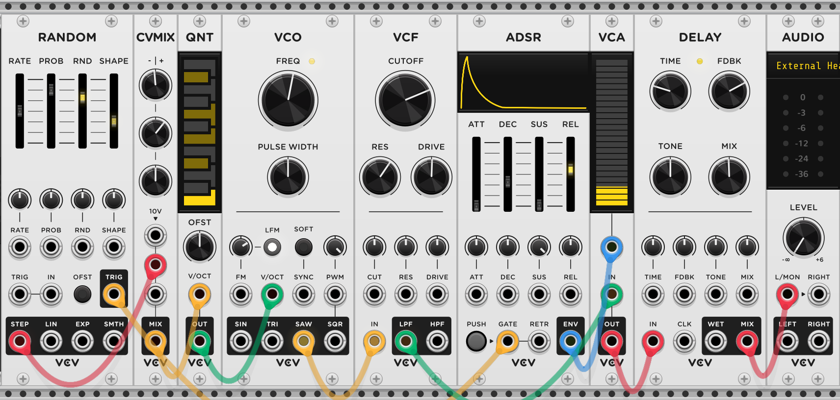 Though VCF is not suitable for acid, the patch Banjo.vcv uses it to create a sound reminiscent of a banjo, though it certainly wouldn’t be confused for one.