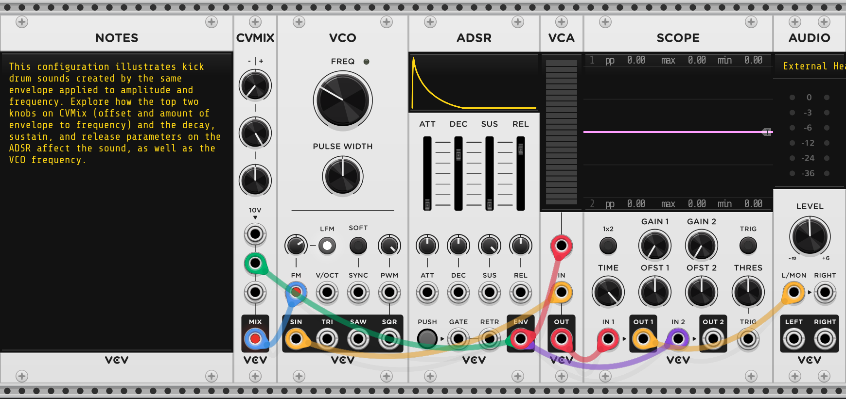 This configuration doesn’t have a way of generating gate signals to trigger the envelope, but the ADSR module has a manual push button we can use (which will sustain if you click-and-hold). The cables are set up so that the envelope is not only used for the CV of VCA as described above, but also for the FM input of VCO. So the frequency of the oscillator also rises and falls following the contour of the envelope. Here is another place where a sine wave is useful, as we don’t want higher harmonics in a kick drum. CVMIX is not doing much in the initial configuration; it is there for your experimentation.