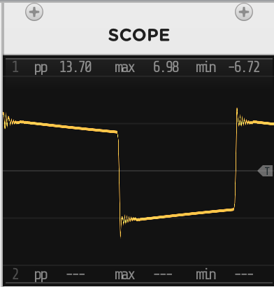 For more drastic changes in timbre, drag the cable from the TRI output to the SAW (sawtooth) or SQR (square) output. These are definitely richer sounds. Sawtooth is an idealized version of the sounds produced by bowed string instruments such as violin, and square sounds more like wind instruments such as clarinet. You will notice more oddities on SCOPE where the lines are supposed to be vertical.