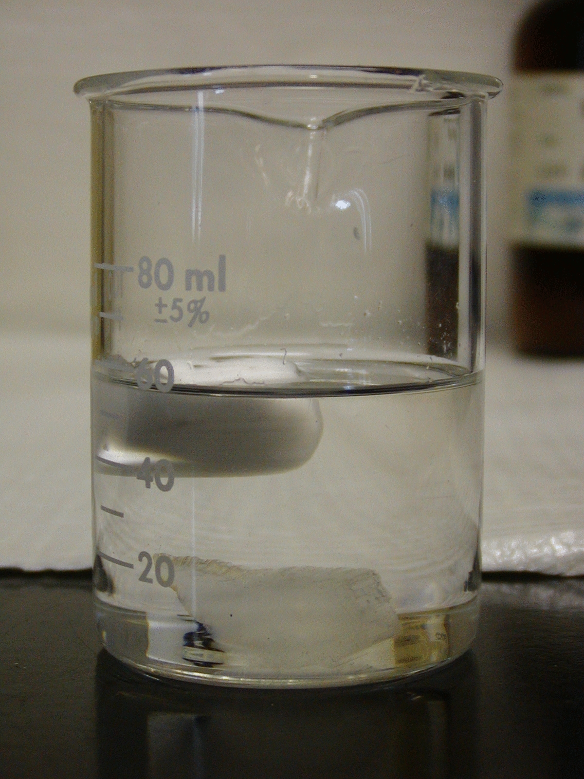 Here's how to tell them apart. Both minerals are very light, but ulexite is somewhat less dense; reference works give a specific gravity ranging from 1.6 to 1.96. Gypsum is heavier, with a specific gravity ranging from 2.2 to 2.32. With the aid of Lew Brubacher and Mike Chong of the Department of Chemistry at the University of Waterloo, we took a picture of ulexite floating and gypsum sinking in a beaker of liquid of specific gravity 2.1 (created by mixing bromoform and methylene chloride).