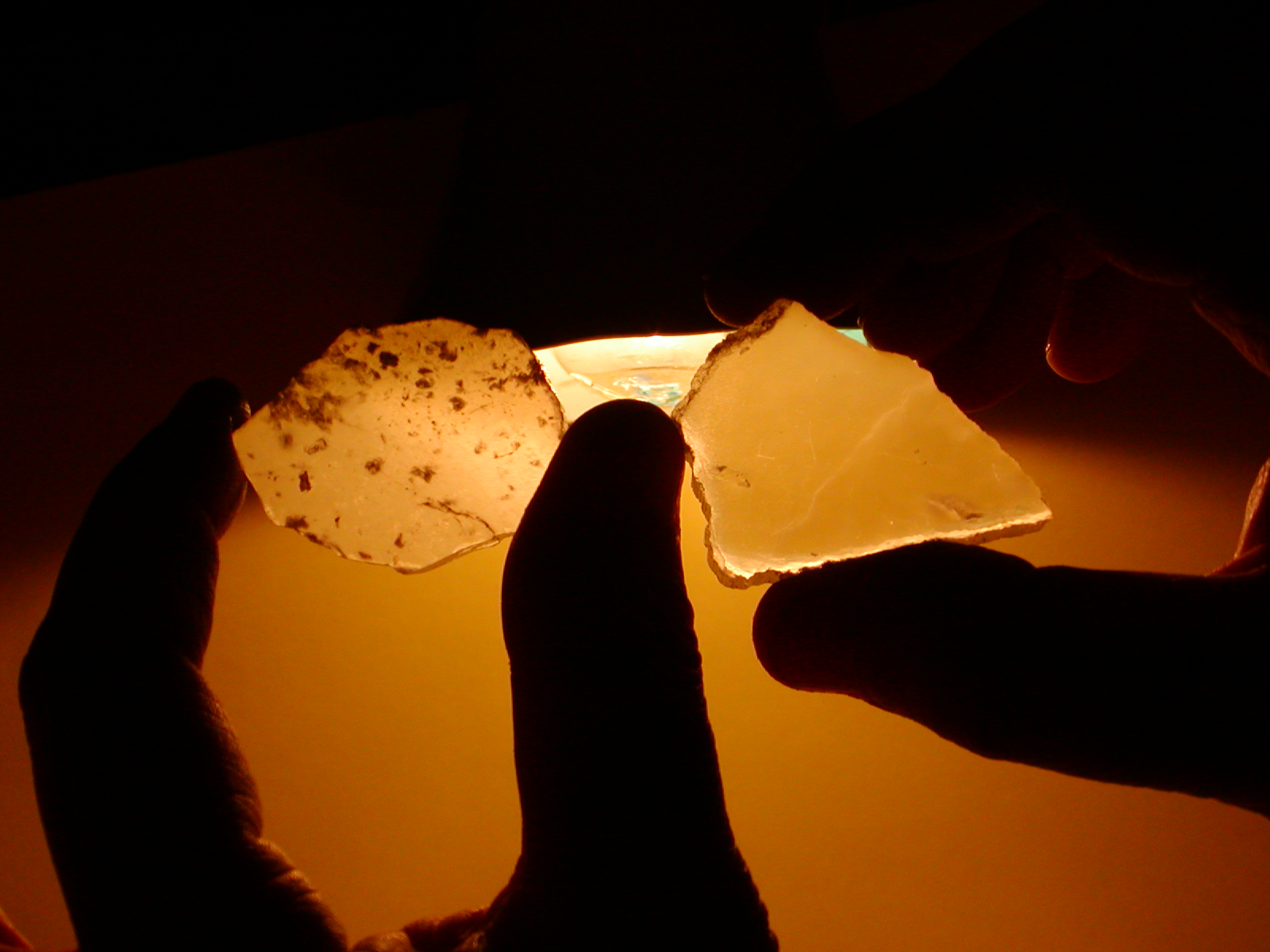 Figure 5: ulexite (left) showing typical inclusions; satin spar gypsum (right) showing typical crack.