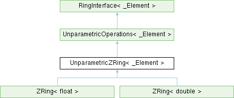 Inheritance diagram for UnparametricZRing< _Element >:Public Types | |