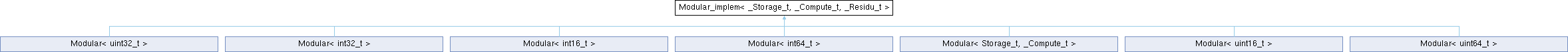 Inheritance diagram for Modular_implem< _Storage_t, _Compute_t, _Residu_t >:This class implement the standard arithmetic with Modulo Elements.