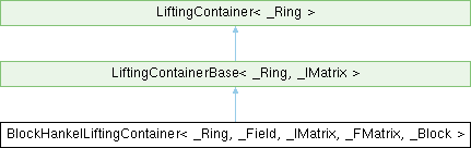Inheritance diagram for BlockHankelLiftingContainer< _Ring, _Field, _IMatrix, _FMatrix, _Block >:Public Types | |