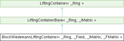 Inheritance diagram for BlockWiedemannLiftingContainer< _Ring, _Field, _IMatrix, _FMatrix >:Public Types | |