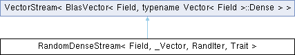 Inheritance diagram for RandomDenseStream< Field, _Vector, RandIter, Trait >:Public Member Functions | |
