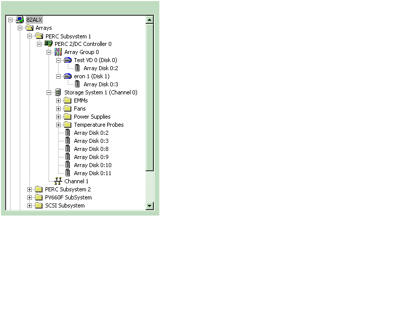 In the sample screen above, the fully expanded Arrays object hierarchy shows both the Physical Array and the Logical Array. The Physical Array object has a PERC 2/SC controller that contains a single channel, Channel 0, with five array disks. The array disk numbering corresponds with the number of the channel and the SCSI ID. In the screen above, the array disks 0:0, 0:1, 0:2, 0:3, and 0:4 are connected to Channel 0 and occupy SCSI IDs 0 to 4.