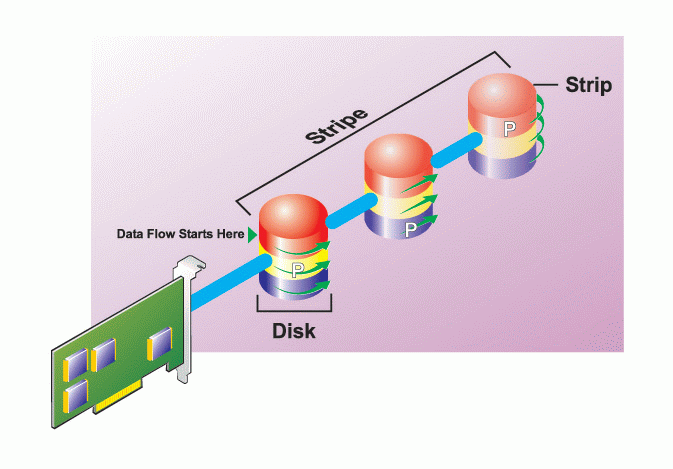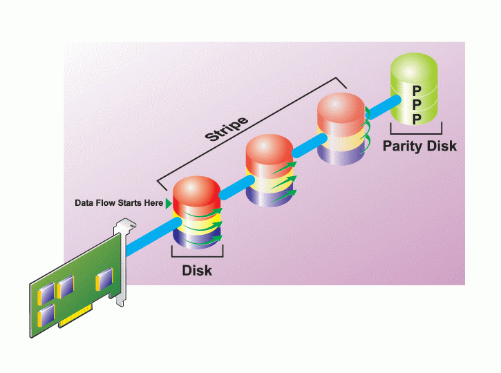 Similar to RAID 3, RAID 5 provides data redundancy by using data striping in combination with parity information. Rather than dedicating a drive to parity, however, the parity information is striped across all disks in the array.