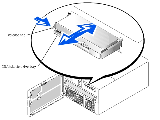 Figure 7-2. Removing and Replacing the CD/Diskette Drive Tray