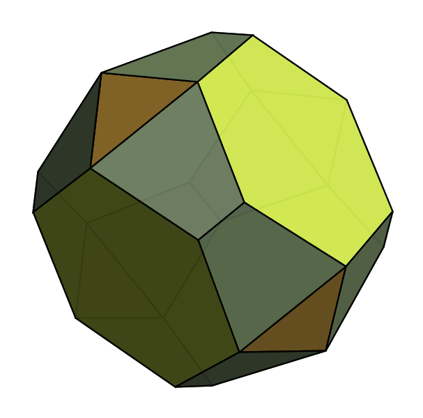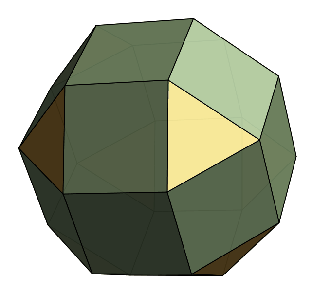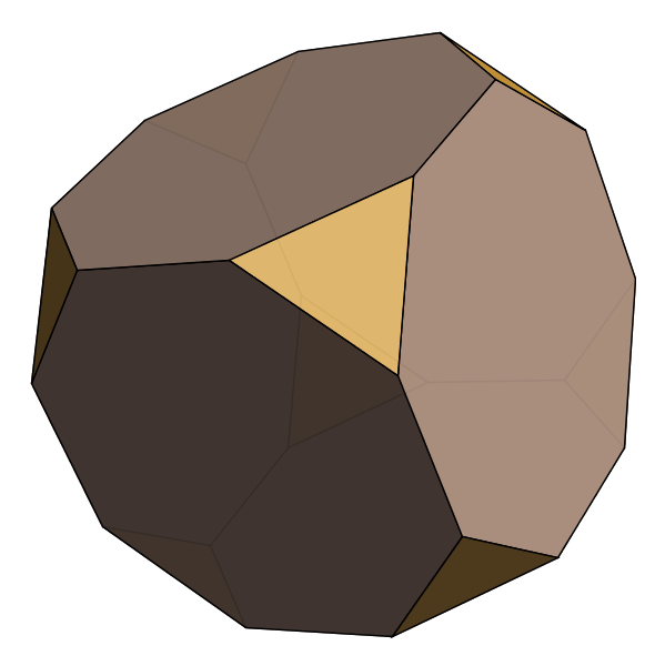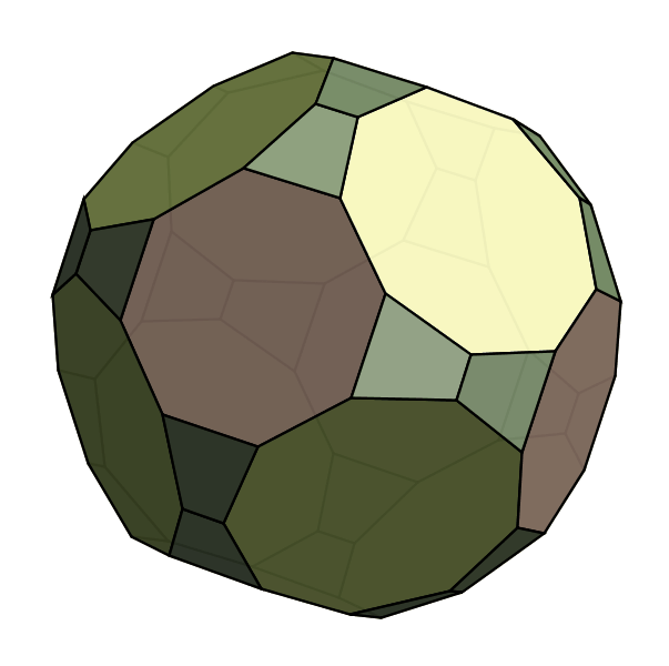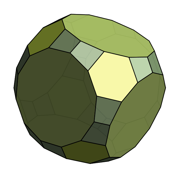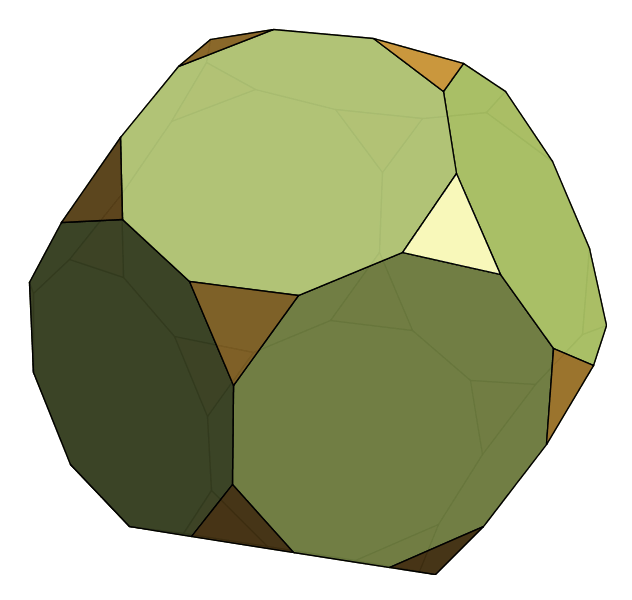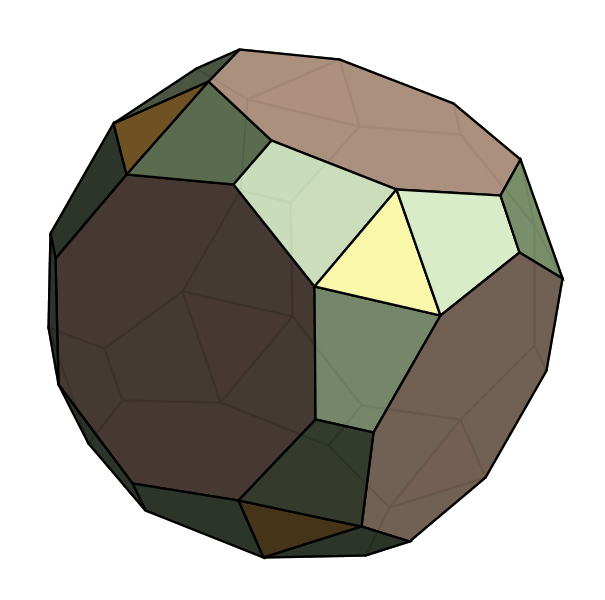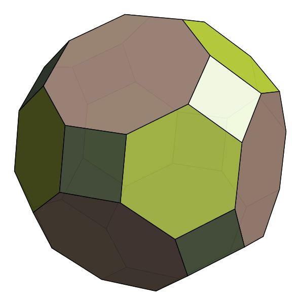Because all of these families are so well-known, we have to start looking further afield to come up with interesting new polyhedra. We knew that we liked regular faces and convexity, but as you can see above that combination is captured by the Johnson solids. So we decided to loosen up on "all faces regular", and asked only that many faces be regular. Obviously, this property is a bit fuzzy, so there's no right way to enumerate all such polyhedra. Instead, we devise an explicit notation and construction technique that yields polyhedra in this family. Because our construction builds polyhedra by starting with a symmetry group, we call them Symmetrohedra: