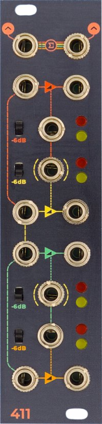 Each oscillator has a large coarse tuning knob, which can be locked against accidental variation while playing (the one digital part of this otherwise analog module) and a fine tuning knob which remains active. Tucked in among the yellow and green sections are a red AM/RM section, and a "modulation bus", which is a VCA normalled to four inputs of the white section making up the right third of the module.
