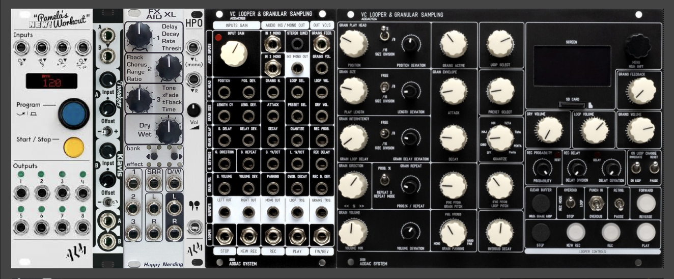 ALM Busy Circuits Pamela’s New Workout (8hp) for clocks, synchronized LFOs, gate sequences, and snappy envelopes. Pam’s does so much that it is the obvious choice for a small case. Although there is a screen and structured menu, it takes about five minutes of instruction or reading the manual to get the hang of the basics, and experimentation will take one a long way towards working out the rest.