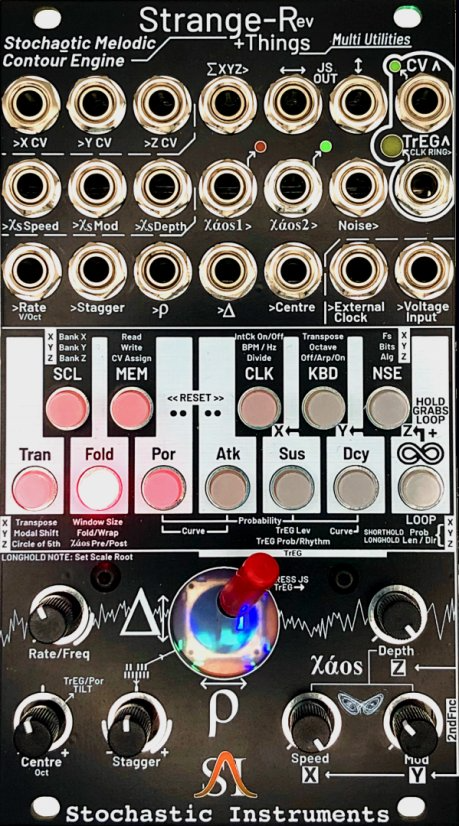 This one is less complete. It lacks an output module, for example, and while it has three independent voices, it has only two function generators, with the only VCAs linked to those in the same module. The skiff is dominated by the two idiosyncratic and unusual melodic sequencers made by Stochastic Instruments.