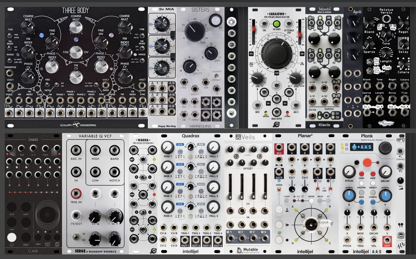 In addition to Three Body, VCFQ below it is usually used as a voice, and Plonk at lower right models a wide range of percussion instruments. There is a sequencer, a quad function generator, a triple filter, VCAs, mixers, utility modules, and two effects modules.