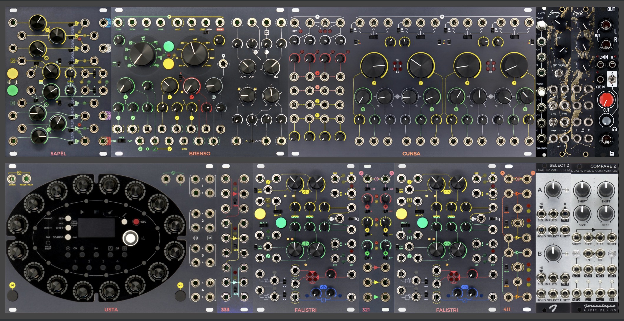 At top right, a pair of Knob Farm modules provide stereo send/return for effects, and the ability to mix the return with other sounds from the case before being sent out. At bottom right are two clever building-block modules (offering two CV-controlled selectors and two window comparators respectively) which fit into the general philosophy of the case, reminiscent of larger panels by Serge (about whom more, below). This case is nearly all analog; only Usta is digital.