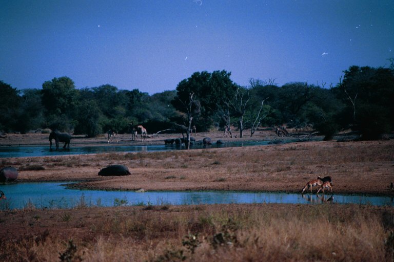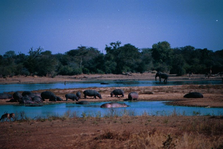 - Waterhole with hippos, elephant, giraffes, and impala, Kruger National Park